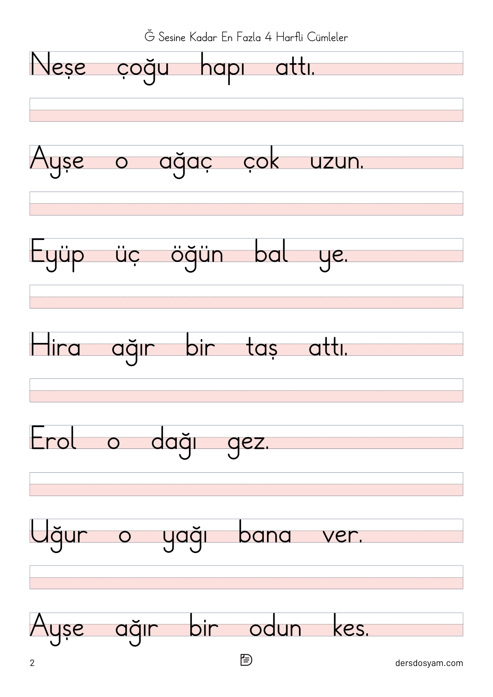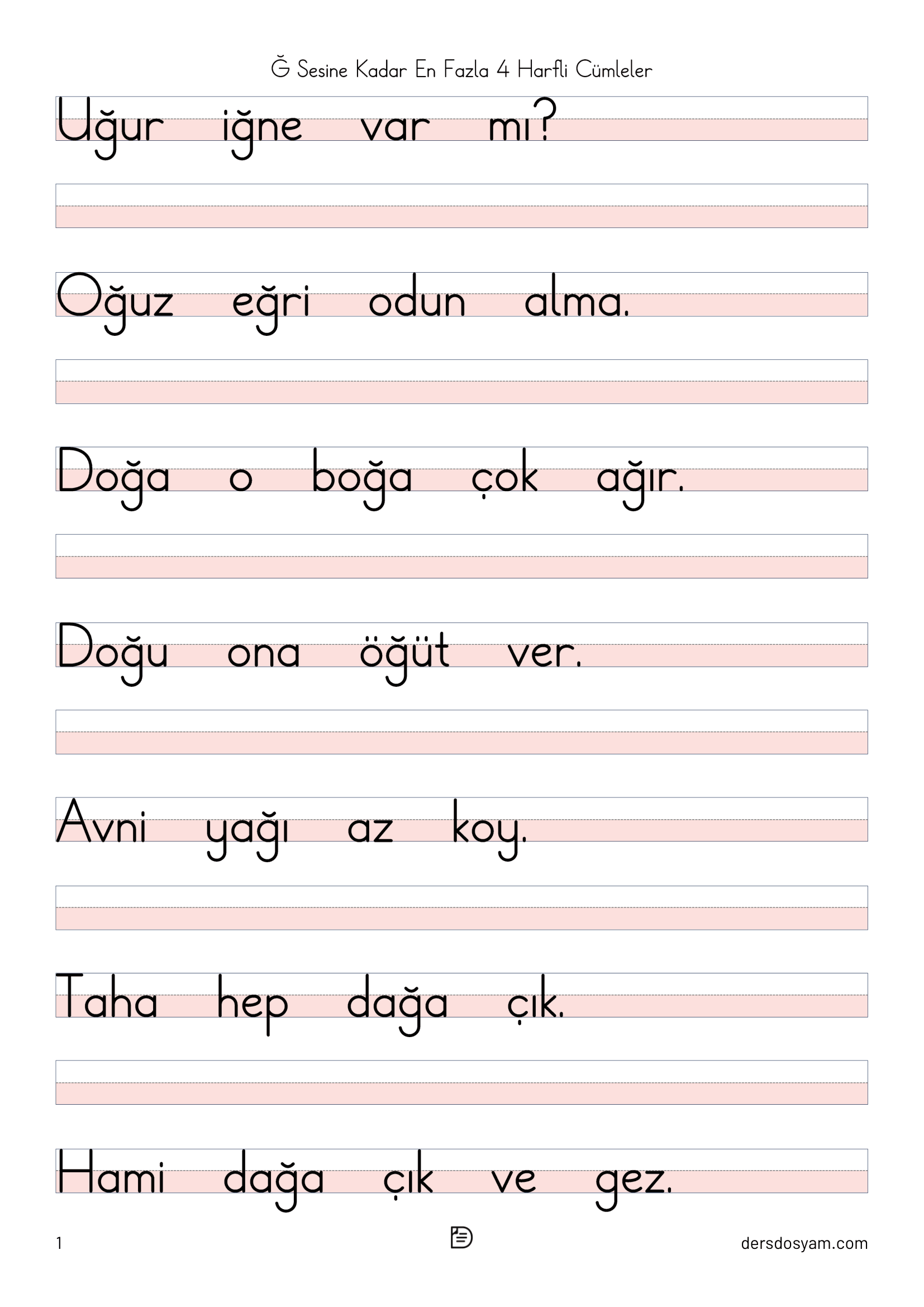 Bu çalışma kağıdında öğrencilerin okuma sürecini kolaylaştırmak amacıyla yalnızca en fazla 4 harfli kelimelerden oluşan cümleler kullanılmıştır. Tüm cümlelerde "ğ, Ğ" sesi yer almakta ve öğrencilerin hedef sesi fark ederek okuma yapmaları desteklenmektedir.