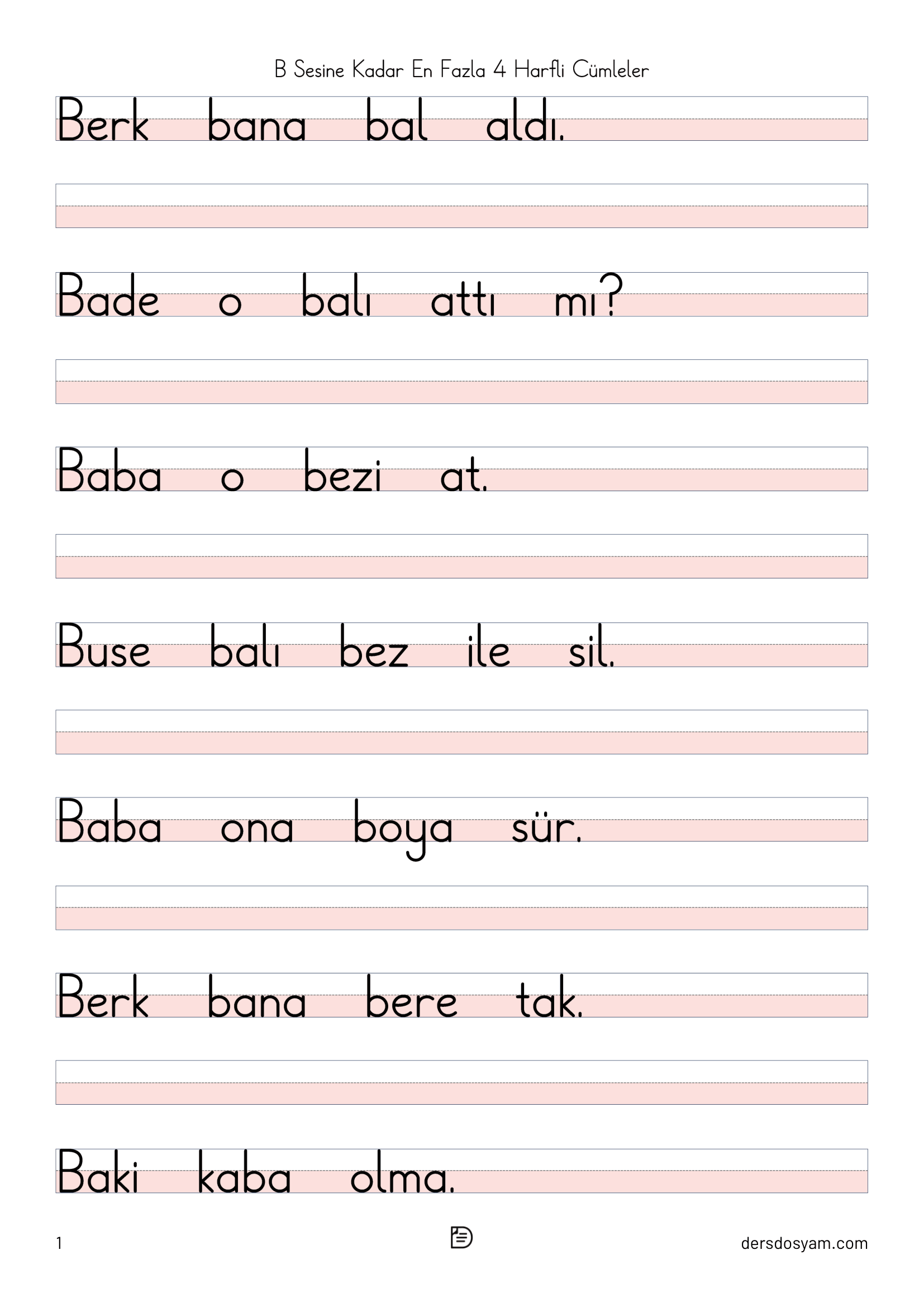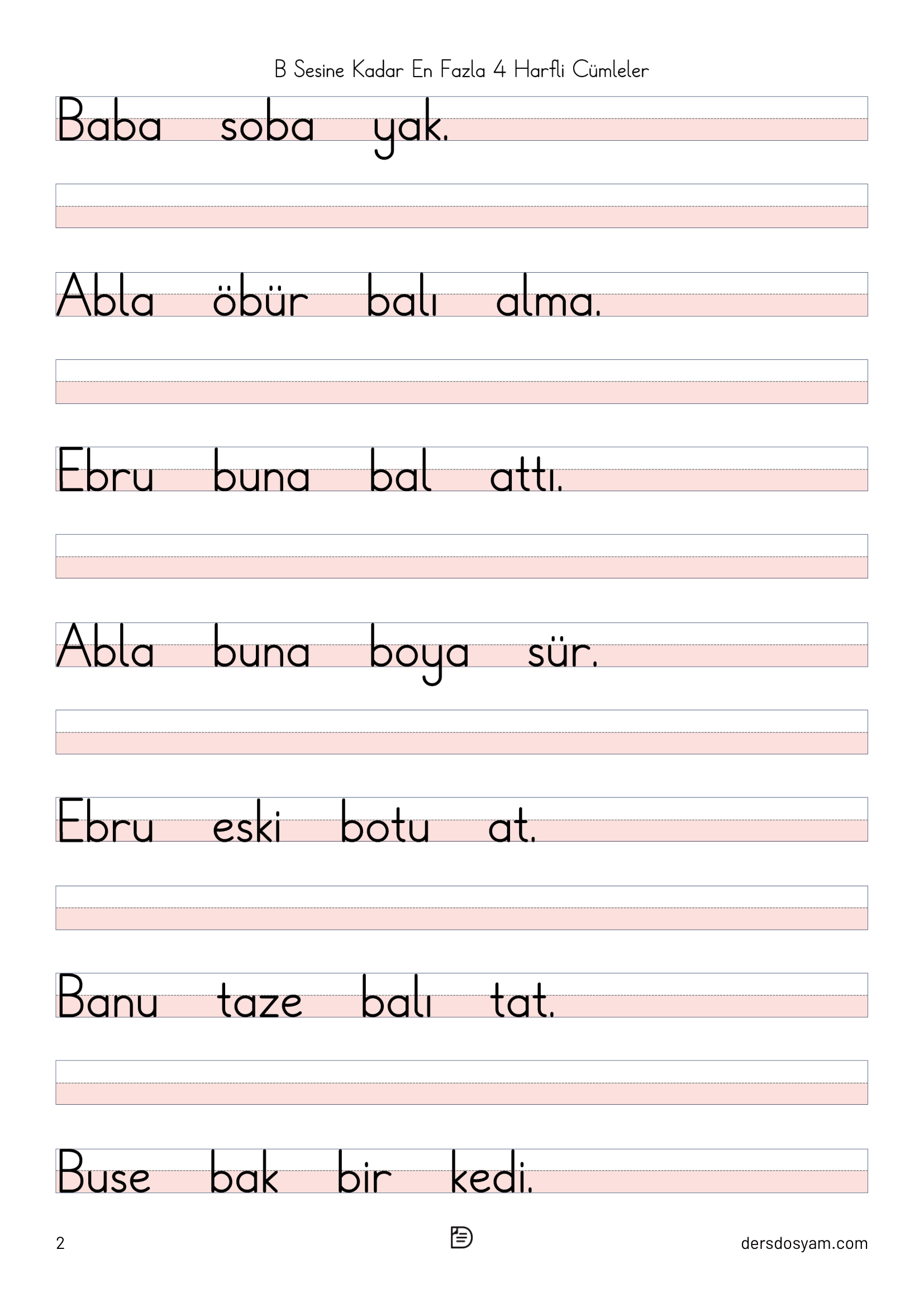 Her cümle için üst bölümde okuma alanı, alt bölümde ise yazma alanı bulunmaktadır. Bu sayede öğrenciler önce okuyup ardından yazarak öğrenmelerini pekiştirirler. Özellikle okuma özgüveni düşük öğrenciler için ideal bir başlangıç materyalidir.