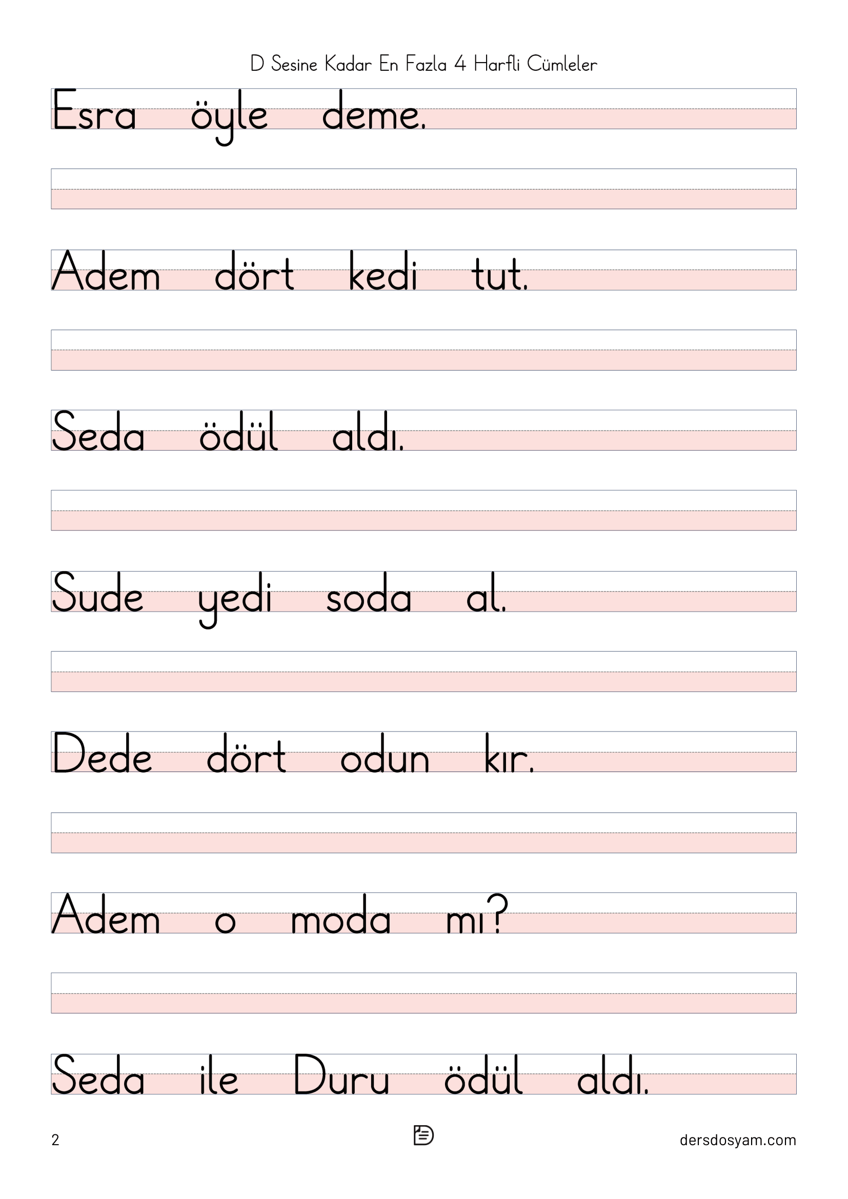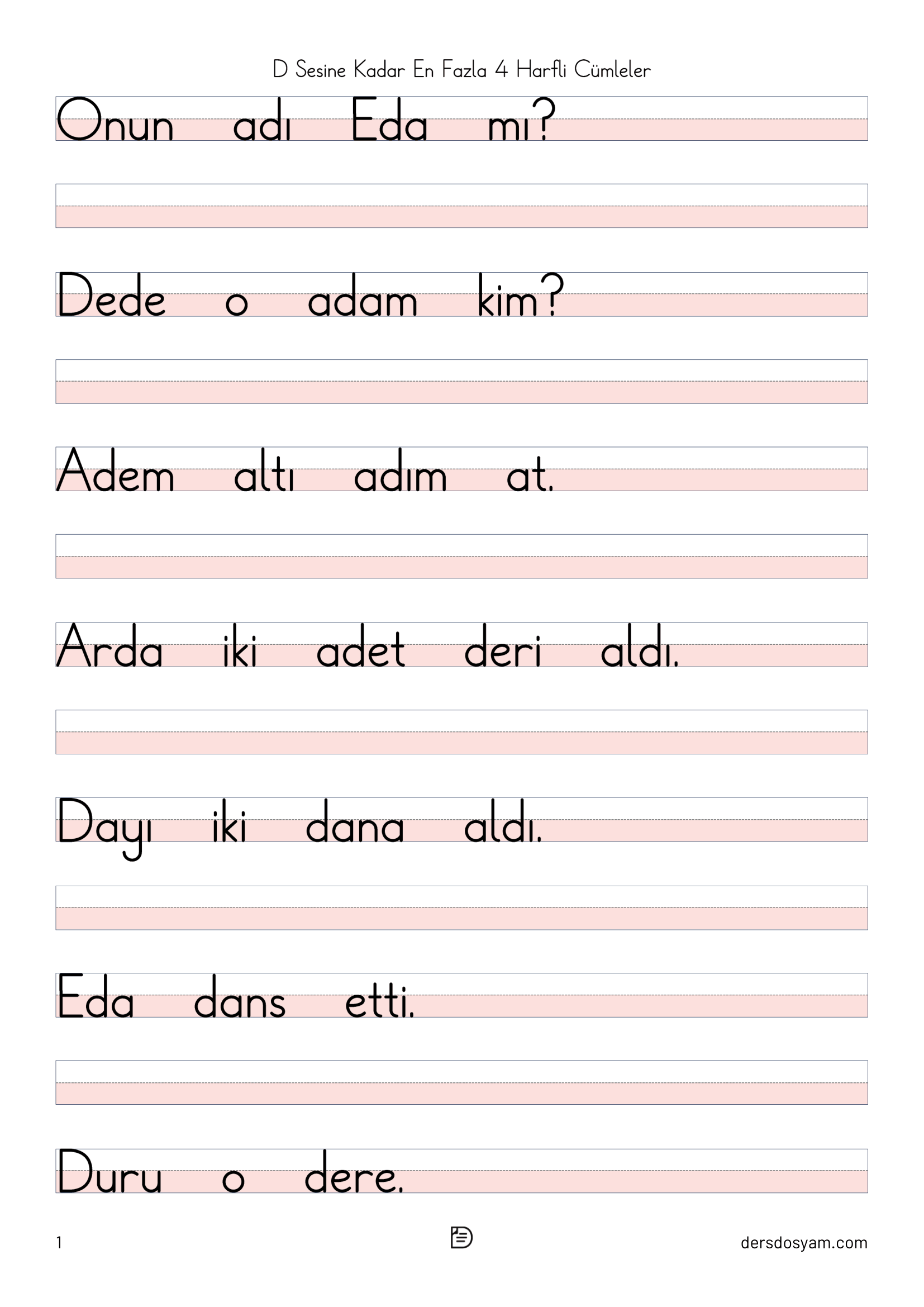 Bu çalışma kağıdında öğrencilerin okuma sürecini kolaylaştırmak amacıyla yalnızca en fazla 4 harfli kelimelerden oluşan cümleler kullanılmıştır. Tüm cümlelerde "d, D" sesi yer almakta ve öğrencilerin hedef sesi fark ederek okuma yapmaları desteklenmektedir.