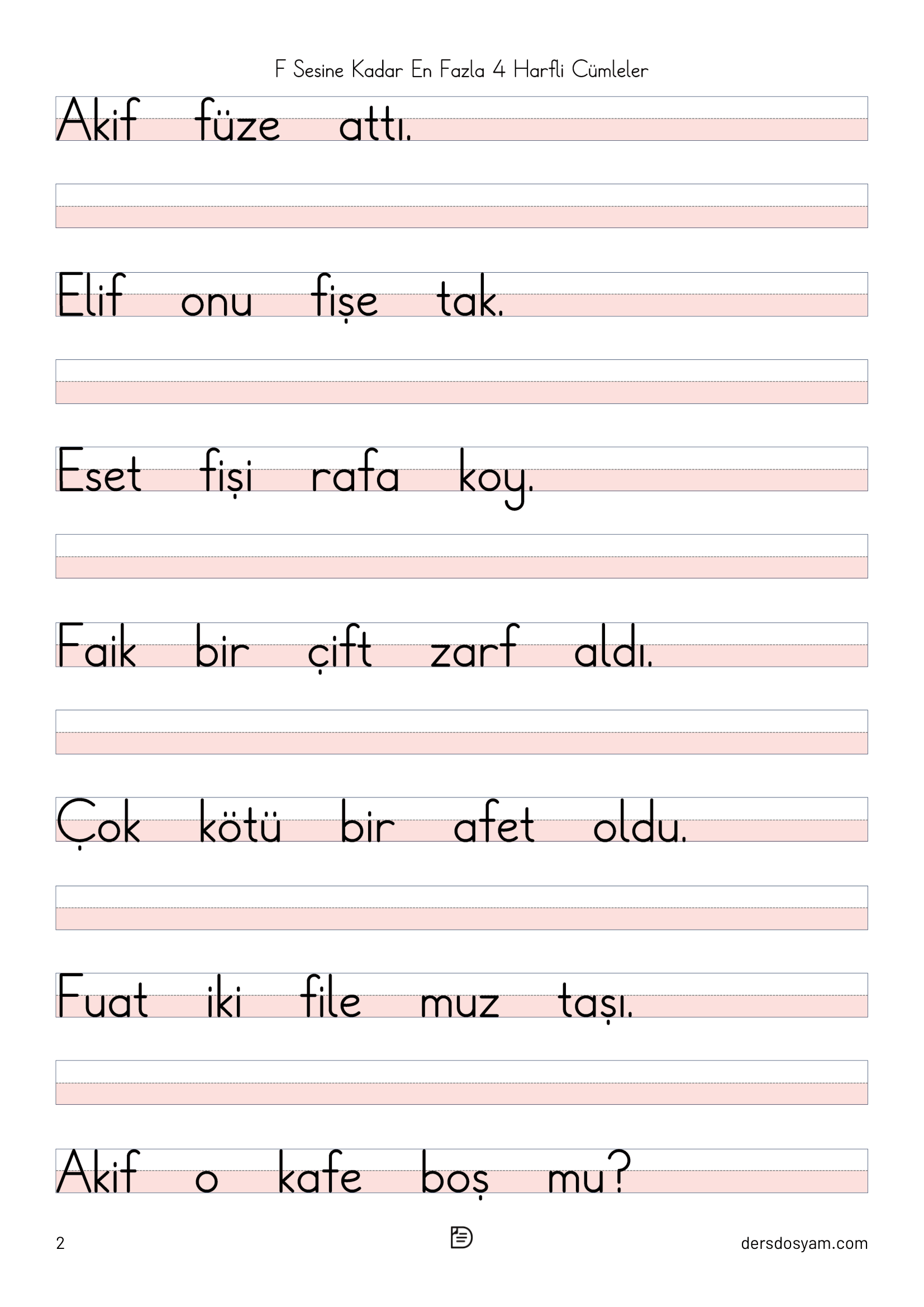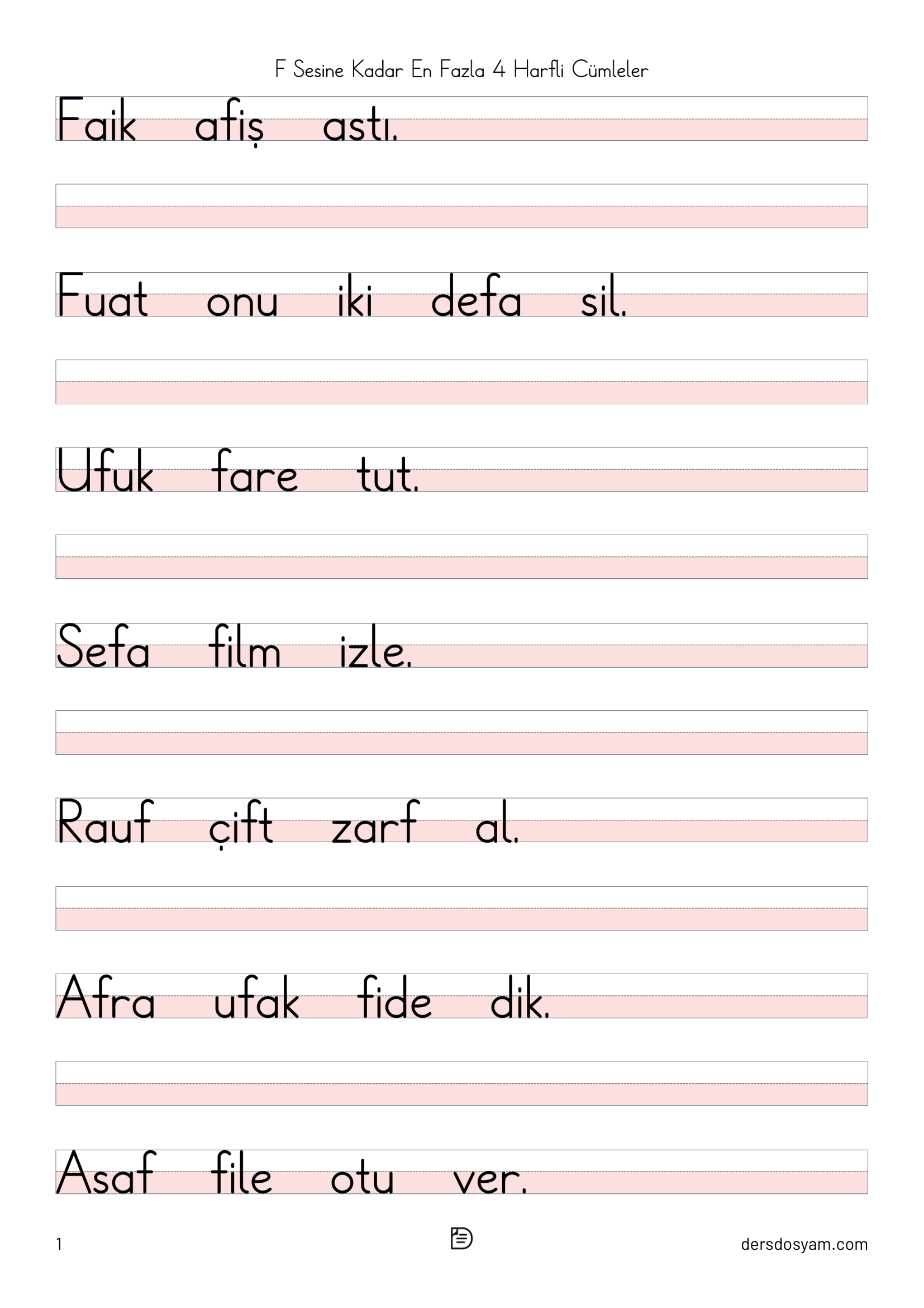 Bu çalışma kağıdında öğrencilerin okuma sürecini kolaylaştırmak amacıyla yalnızca en fazla 4 harfli kelimelerden oluşan cümleler kullanılmıştır. Tüm cümlelerde "f, F" sesi yer almakta ve öğrencilerin hedef sesi fark ederek okuma yapmaları desteklenmektedir.