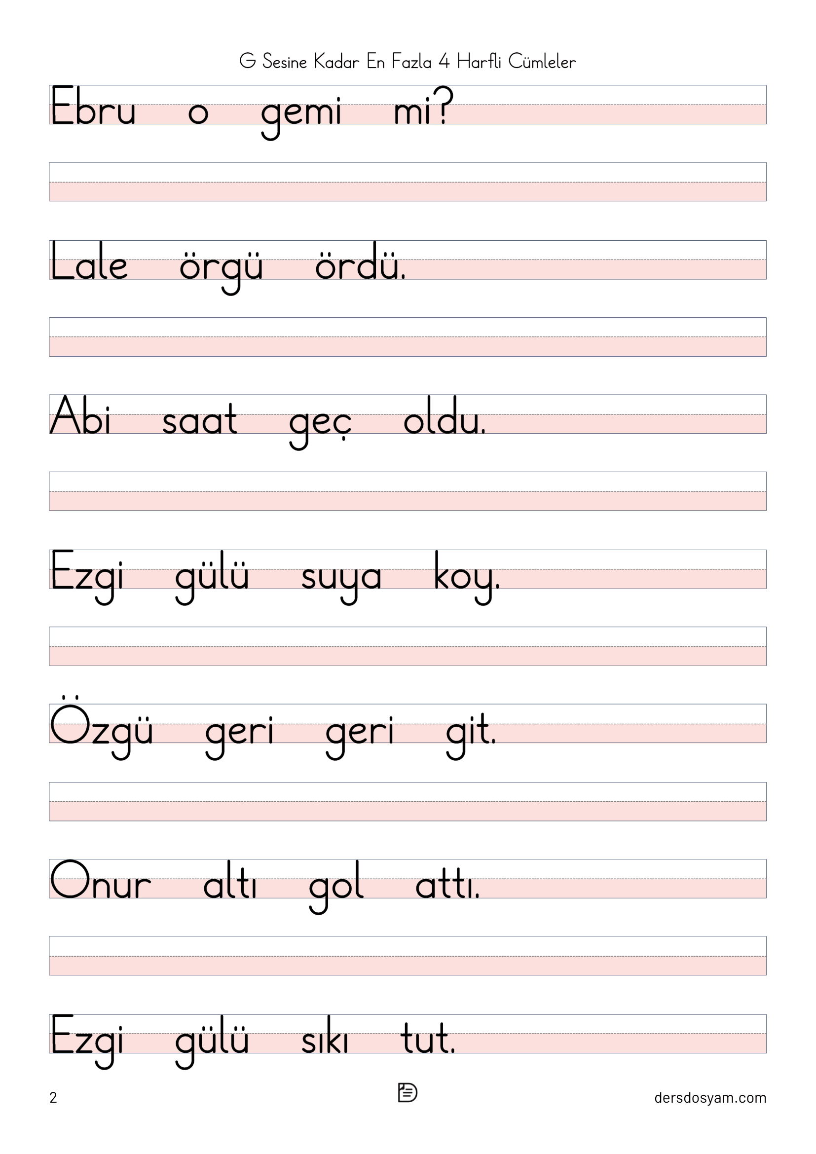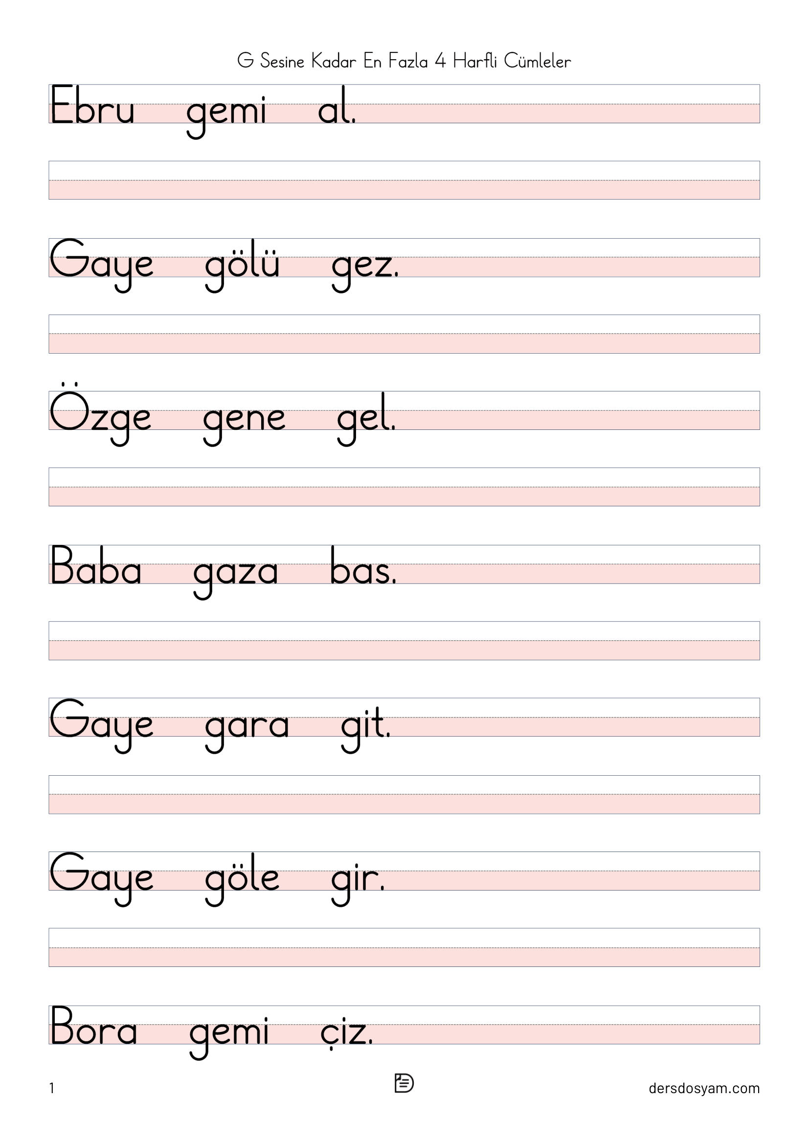 Bu çalışma kağıdında öğrencilerin okuma sürecini kolaylaştırmak amacıyla yalnızca en fazla 4 harfli kelimelerden oluşan cümleler kullanılmıştır. Tüm cümlelerde "g, G" sesi yer almakta ve öğrencilerin hedef sesi fark ederek okuma yapmaları desteklenmektedir.