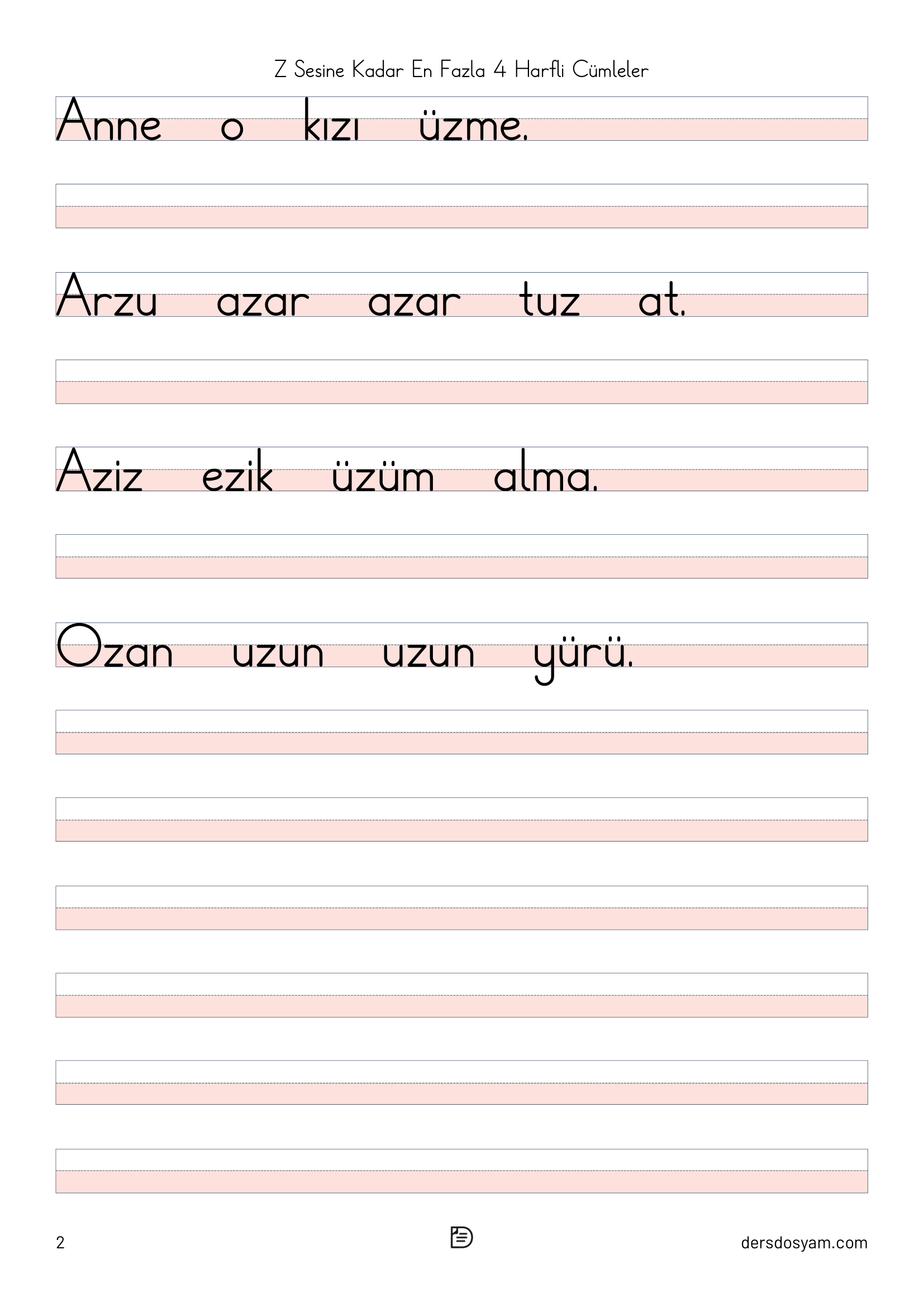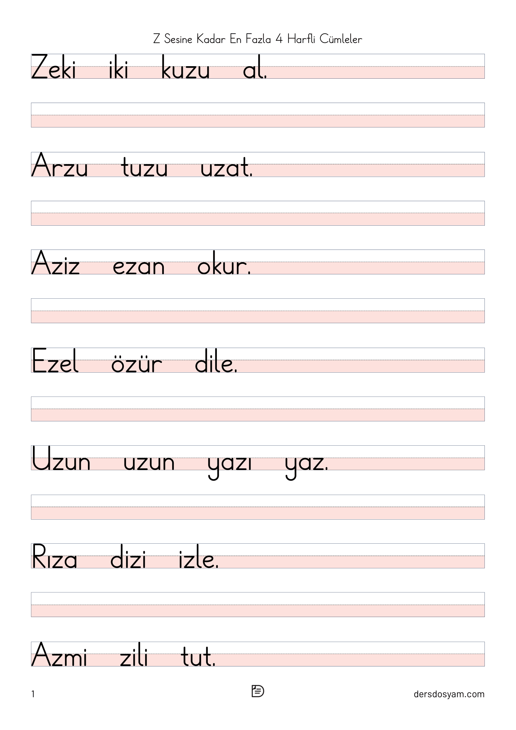 Bu çalışma kağıdında öğrencilerin okuma sürecini kolaylaştırmak amacıyla yalnızca en fazla 4 harfli kelimelerden oluşan cümleler kullanılmıştır. Tüm cümlelerde "z, Z" sesi yer almakta ve öğrencilerin hedef sesi fark ederek okuma yapmaları desteklenmektedir.